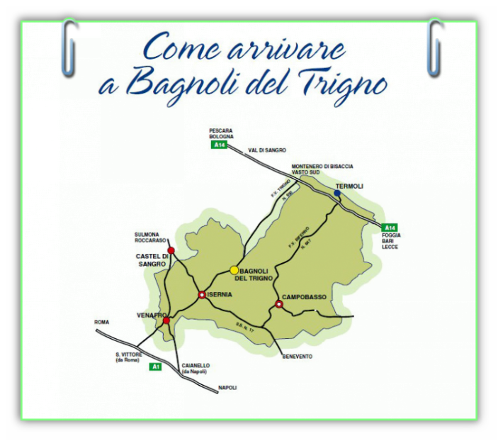 Per chi proviene da Napoli, uscita Caianello sull'autostrada A1, proseguire per Venafro - Isernia. Proseguire sulla Trignina in direzione Vasto - San Salvo, uscita Bagnoli del Trigno.